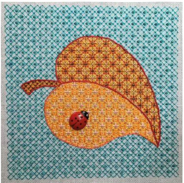 • Janice M finished stitching Ann Strite-Kurz’s Leaf Luster, a workshop held at Needleworker’s Delight in mid-May. Janice changed some of the thread colors and bought a smaller version of the ladybug on Etsy.