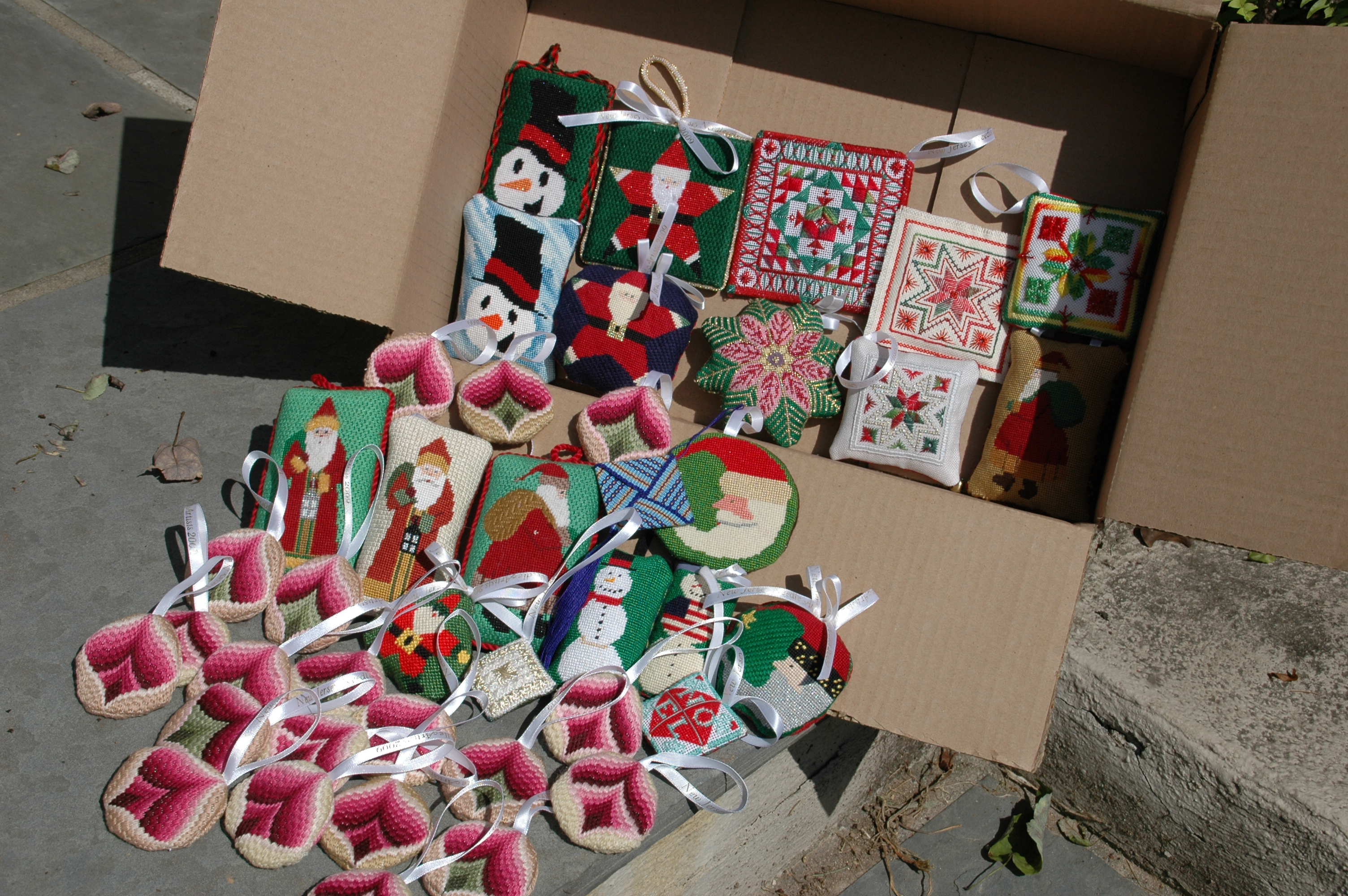 NJNA-stitched Ornaments being packed for shipping to Maine.