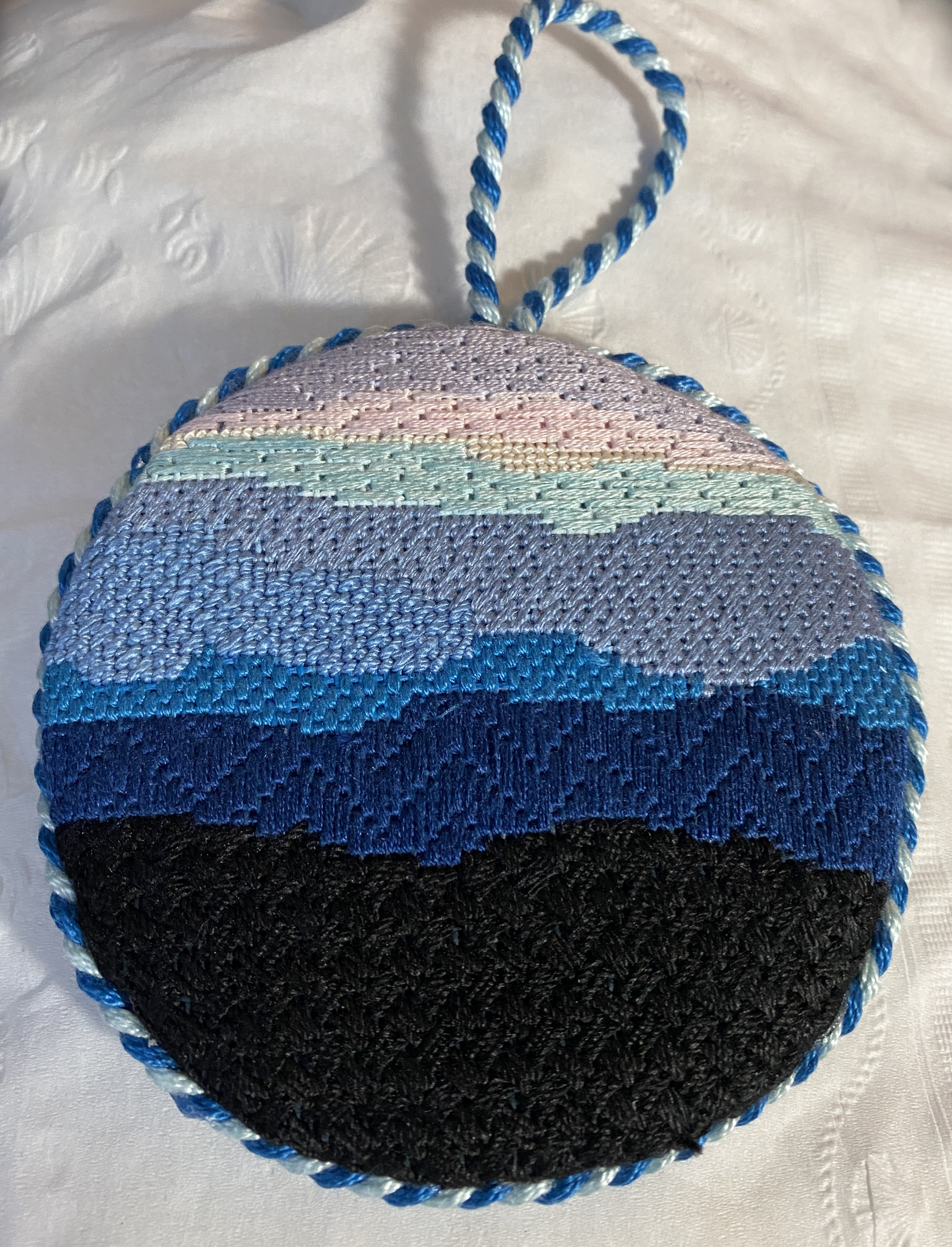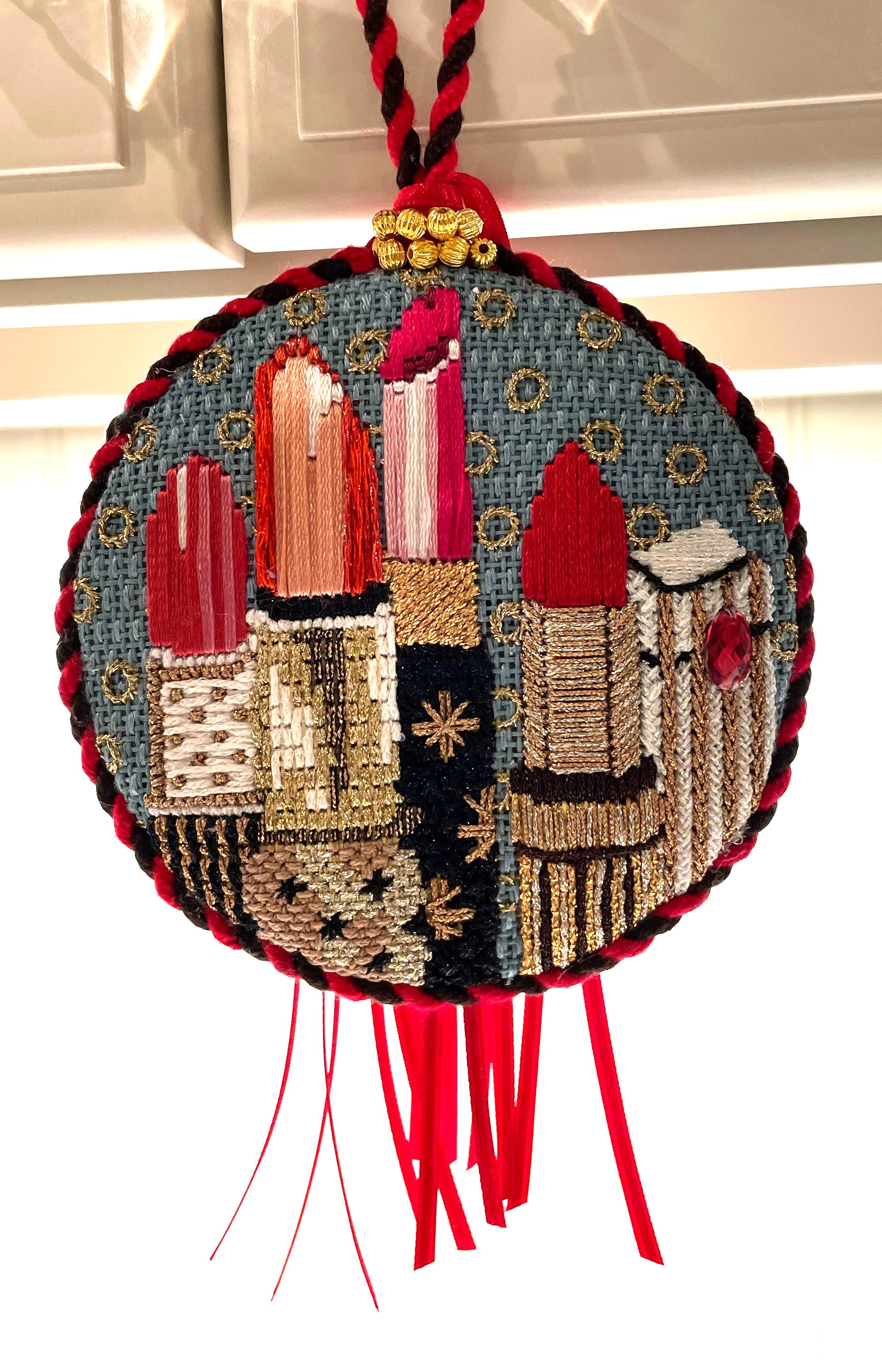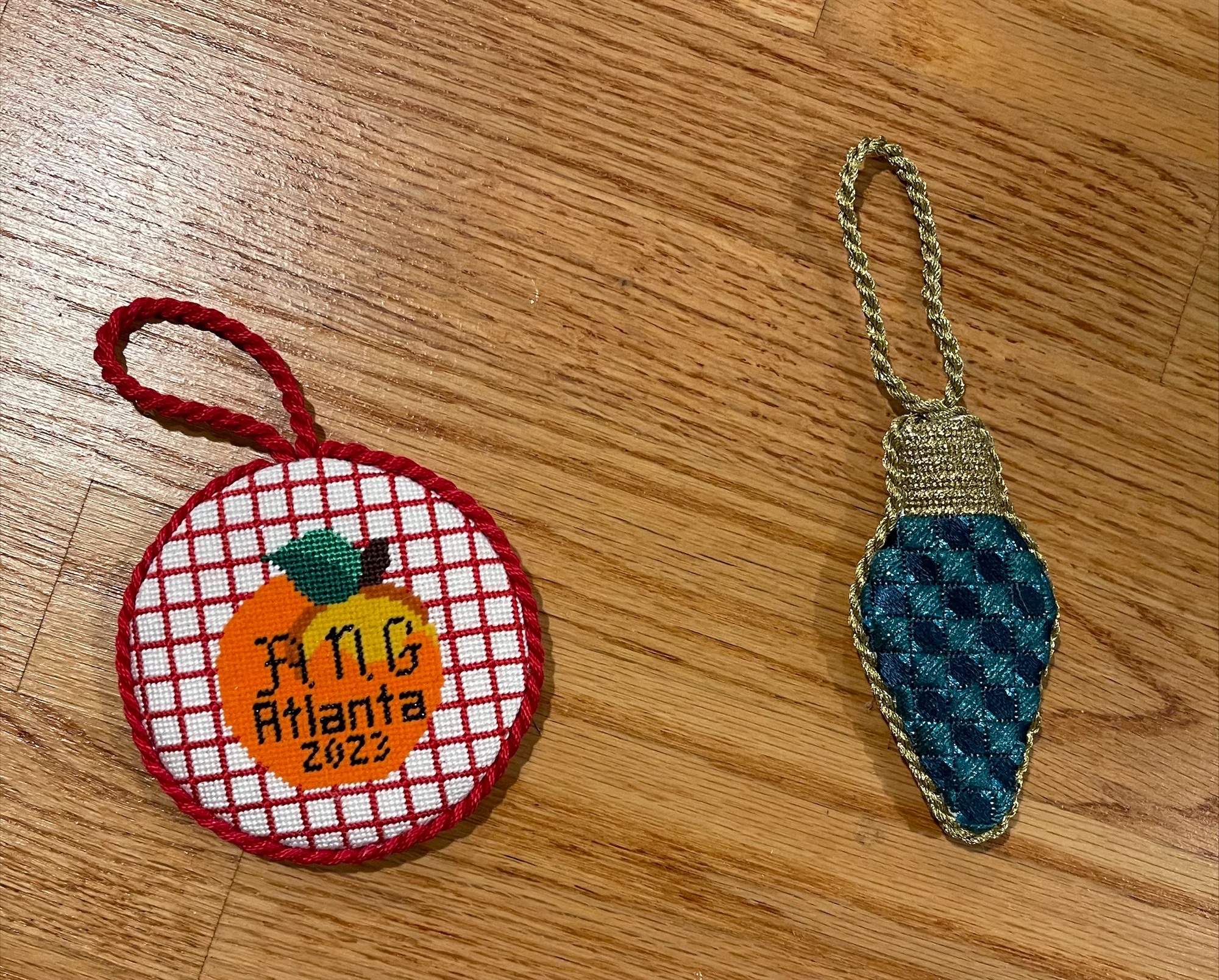 NJNA hosted Kelly Starke of Starke Art Designs to teach ornament finishing workshops in October of 2023.  The Basic Level Workshop was for a round needlepoint ornament while the Intermediate Level Workshop was for a shaped needlepoint ornament.  The Basic Level Workshop was in the morning and the Intermediate Level Workshop in the afternoon. Both classes filled up with most people (about 15) taking both sessions.