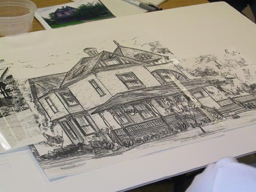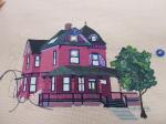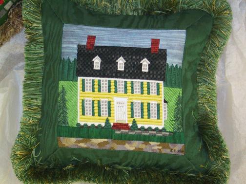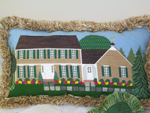 The inspiration for stitching our homes started in the summer of 2004 when Ellen T instructed us on how to paint a canvas. Ellen started with a patriotic star and then urged us on to painting a picture of our house. Some people did their own homes and some ventured out and painted other structures. The following year we decided to continue with the project by learning various stitches to create different surfaces of the buildings we had created on canvas.